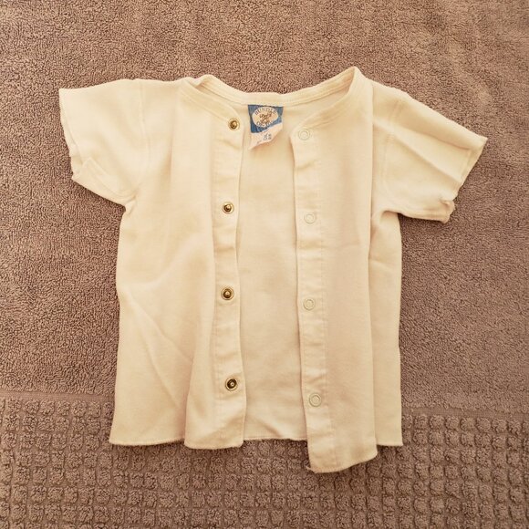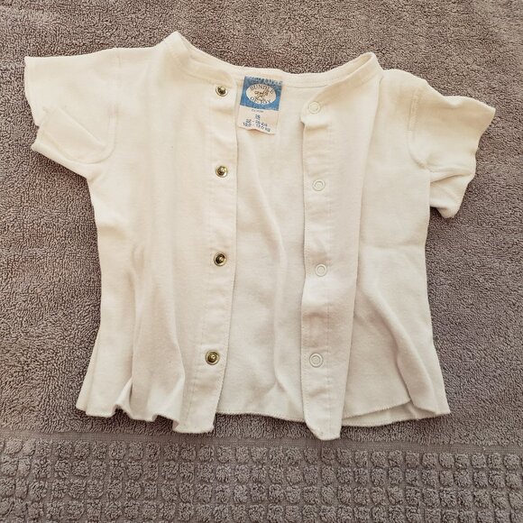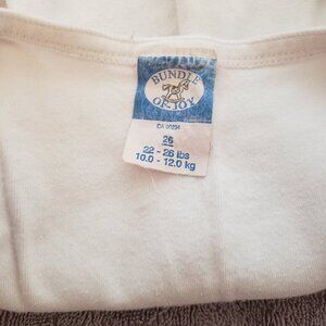 A set of 2 identical undershirts from Bundle of Joy, they have snaps in front to make it easier for dressing. It is a size 22 – 26 pounds or 10.0 – 12.0 kilograms and is 100% cotton.