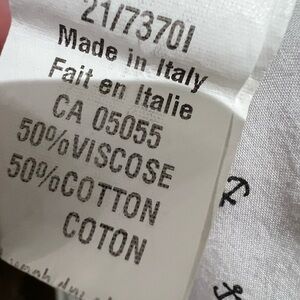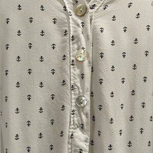White shirt with black anchor pattern. Buttons halfway down. The back is longer than the front. Sleeves button up to 3/4 length. Size large. 50% cotton, 50% viscose. Made in Italy.