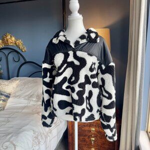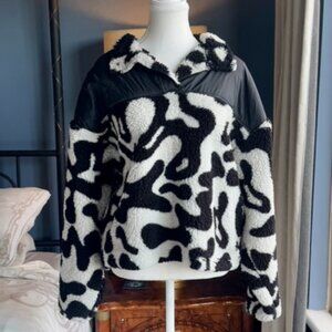 White and black swirl design sherpa leece pullover with snap buttoned collar and nylon upper, size L from Grayson Threads. Good used condition. Bust measures 24.5 laying flat, waist 20 inches flat, length shoulder to hem is 22 inches at front, 24 at back. Cat friendly, nonsmoking home.
