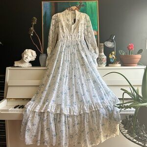 This stunning sundress features a tiered, ruffled skirt in a beautiful white and blue color palette, perfect for a wedding guest or casual outing. The long bishop sleeves and mandarin collar add a touch of elegance, while the flowing design ensures comfort and style. Ideal for making a statement at any event. Some piling, seam undone at some spots, very rare! in good condition. Tag says size 9.
