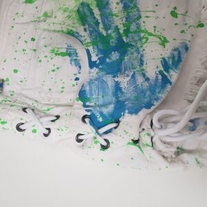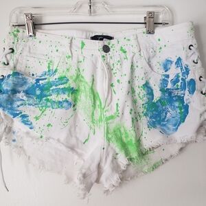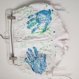 Stylish women's shorts featuring a vibrant blue and green splash design on a white base. Perfect for a casual day out.