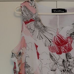 This sleeveless sundress boasts a scoop neckline and a flowing high-low hemline, ideal for a wedding guest. The dress is adorned with a romantic watercolor floral pattern in pink and gray, set against a white and cream background, offering a soft and elegant look.