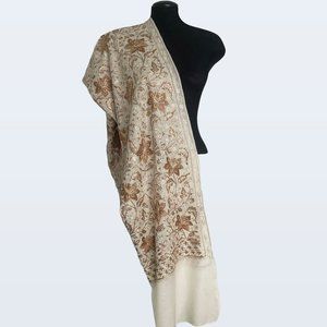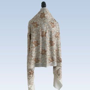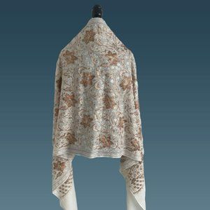 This wool and silk-blend scarf is woven and is individually stitched with delicate and intricate detail. Each piece is a unique work of art and is made by skilled Kashmiri artisans and conveys its own story.
