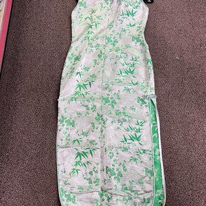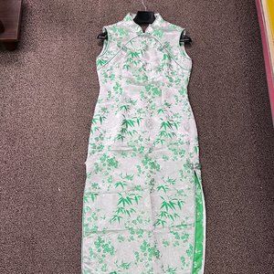 Probably not silk. Most likely polyester. Has a zip up the back. Bust is 36" Length from Pit to hem 43" No tags.