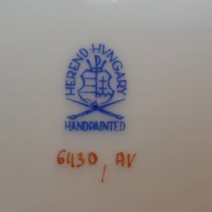 This is a white vase made by Herend in Hungary, date unknown though my guess in in the 1980s or 90s. It is decorated with green leaves and flowers along with spots of orange. The rim has a ring of leaves interspersed with gold colored flowers and there is gold trim. The vase stands 5 1/2" tall and is 5 3/8" across on top. At the time of this listing I also have a matching sugar bowl.