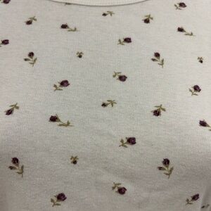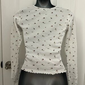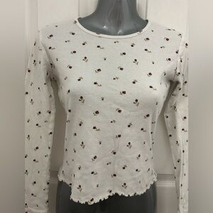 White crop top with long sleeves and small, purple flower pattern. Ruffles at hem of shirt, stretchy material. 15.5” pit to pit when unstretched. 17.5” length from shoulder to hem.