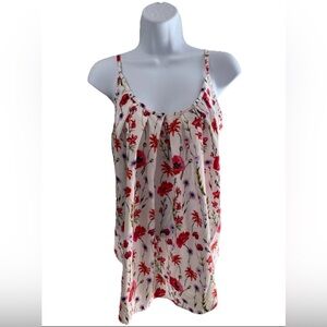 This sleeveless tank top showcases a smocked and pleated design, highlighted by a striking red floral pattern against a crisp white background. The airy fabric and flowing fit make it a perfect choice for warm days.