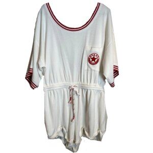 Elegant white jumpsuit with red accents, perfect for a chic and comfortable look.