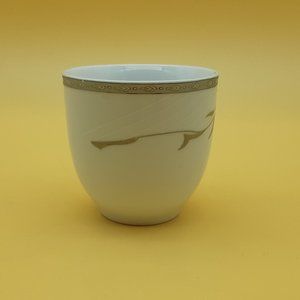 The tea cup stands 2 3/4" tall and is 2 7/8" wide at the mouth. The saucer is 5 1/2" across.