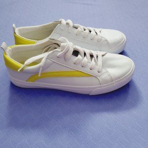#yellow #neon #yellowstripe #neon-yellow #runners #joggers #running shoes #white #whiteshoes