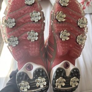 White and pink women’s adidas golf shoes