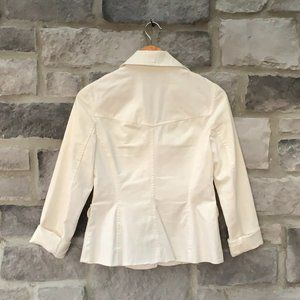 This white cotton women's jacket is very comfortable and goes great with pretty much everything. Can be worn as a suit jacket / blazer, or just with a pair of jeans.