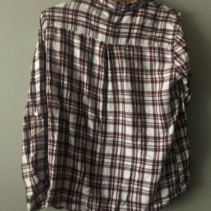 Thin, light fabric. Comfortable and cool. Has buttons on the arms to hold roll ups.