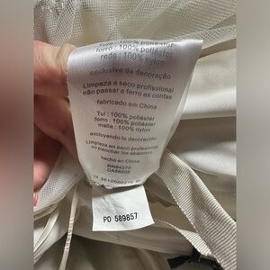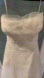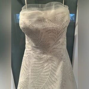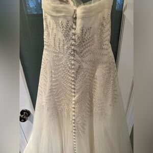 This is such a beautiful wedding dress. It is strapless. The details are stunning. It is buttoned all the way down. It has little toggles so you can lift the length of the skirt while you walk (attaching something to the toggles of course)