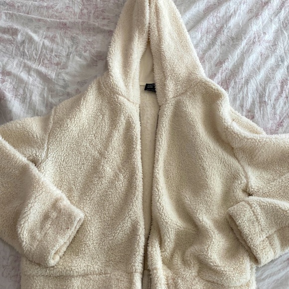 White teddy jacket great quality just missing the zipper but can be paired with a cute cropped tank top and jeans.