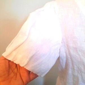 this blouse is the perfect effortless chic for a beach vacation. The short, puffy sleeves add a touch of playful femininity, creating a relaxed silhouette. And then, the subtle glint of gold buttons down the front adds just the right amount of sophistication and polish, elevating the look from casual to stylishly refined. This blouse is more than just a piece of clothing; it's a feeling – light, airy, and ready for salty air, sandy toes, and making memories under the golden sun. It's the kind of piece that can be dressed up with a flowy skirt for a sunset dinner or worn casually with shorts for a day of exploring. This white linen blouse, with its short puffy sleeves and gleaming gold buttons, is the quintessential beach vacation essential.
