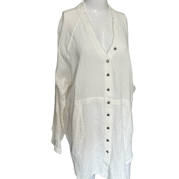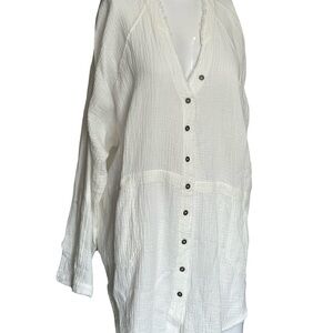 This white top features a relaxed fit and a notched collar, offering a blend of comfort and style. Its button-down design makes it a versatile addition to any wardrobe, perfect for both casual and formal settings. The lightweight fabric ensures a crisp and polished look throughout the day. Great for vacation light and airy! Linen material.