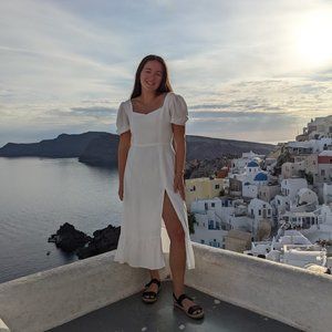 Linen white dress with a fitted bodice, worn once purchased at a boutique in Santorini, Greece