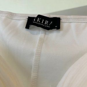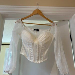 This trendy, white top from Akira will definitely get all eyes on you! Very cute with jeans or mini. The front closes with clasps, and the sleeves are sheer. The cups of the top are also lined. You can also wash at home so you don't have to dry clean! It is a snug fit. Used twice.