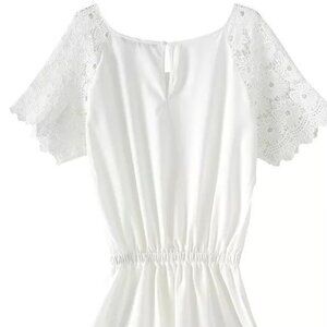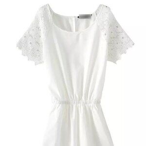 Short-jumpsuit with lace sleeves, elastic waistband. Back closed by a button. Light fabric, slightly transparent.. Brand : NLW. Fabric : 87% cotton/3% elastane. Color : White. Size : Large.