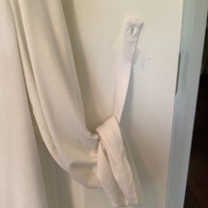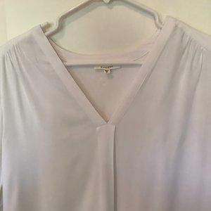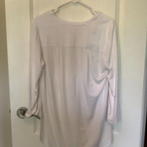 White blouse perfect for all occasions. Under blazers, cardigans, with jeans, or pants. 100% rayon. Pleione. Sleeves and back are soft jersey rayon. Front is crepe-like with V-neck and front pleat. Sleeves have hidden tabs for rolling up leaving long. Back longer than front. Comes to top of thigh, tunic-style.