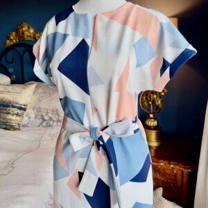 White with peach, navy, and sky blue geometric print midi dress, size L from Ecowish. Belted waist, form fitting, short sleeves, 85% polyester 15% spandex so has a good amount of stretch. Bottom of dress has some small snag marks as shown in photo 7. Bust measures 19 inches laying flat, waist measures 17.5 inches, hips measure 19.5 inches, length is 44 inches. Cat friendly, nonsmoking home.