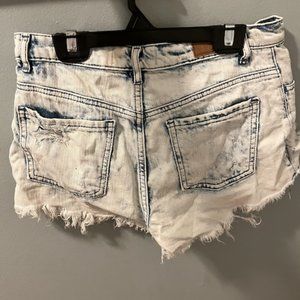 Whitewashed distressed very short high wasted jean shorts. Garage size 5, well worn. The discolouration is shown in photos due to the leather label. Would be good for the beach or cottage etc.