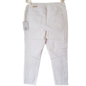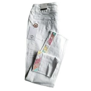 Make a statement with these stunning white skinny jeans from G! Jeans, featuring eye-catching colorful geometric embroidery along the side seams. The soft pastel tones (pink, turquoise, yellow, and mauve) add a fun, boho vibe that’s perfect for spring and summer.