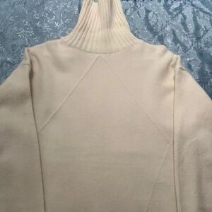 Form fitting Turtleneck sweater that looks and feels great. Very warm and comfortable. Soft wool blend fabric-wool/acrylic/nylon. Size medium. excellent pre-owned condition.