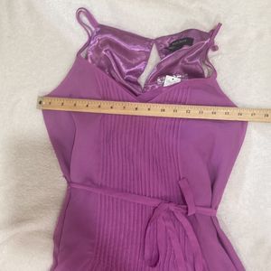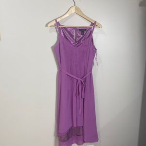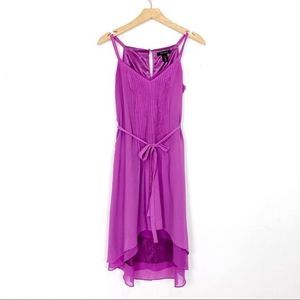 White House Black Market high low spaghetti strap chiffon ruffle pleated tank tie midi dress in lilac lavender purple. Perfect for wedding season size 6