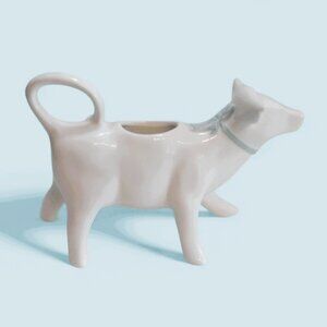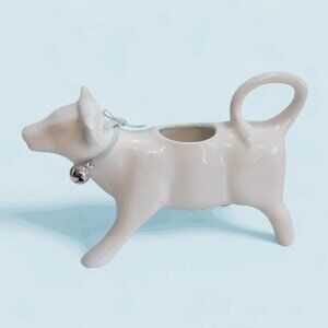 Newbridge Home Whiteware Ceramic Cow Milk/Creamer With Blue Ribbon and Bell.
