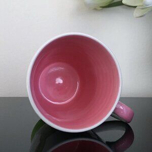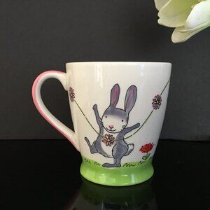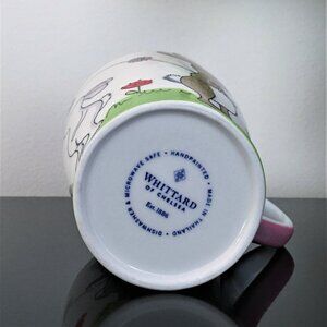 This is a collectible Whittard of Chelsea ceramic mug from the Bunny Rabbit and Friends Collection. It has a cream exterior with a hand-painted bunny rabbit design and a pink interior. The mug is brand new and measures 3-3/4 inches tall.