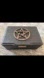 White Candle, matches, assortment of crystals and stones, forged crow feather, and cat bracelet in a solid wood green felt lined box.