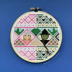 Original hand embroidered cross-stitch inspired by the broadway play & film 'Wicked'. Design includes Glinda, Elphaba, yellow brick road, and Emerald City. Hair is hand braided.
