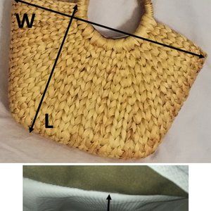 Rigid wicker handbag made from water hyacinth. Approximate sizes (see the last picture): L = 22.5 cm; W = 32.5 cm; D = 8 cm; Handle Diameter = 10.5 cm. Real colors might be slightly different from the pictures due to the camera.