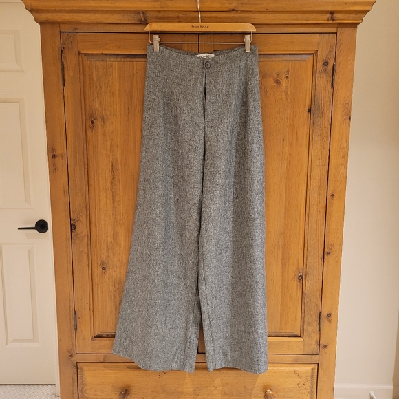 Wide leg but fitted waist (smaller Medium). Button & zipper closure.
