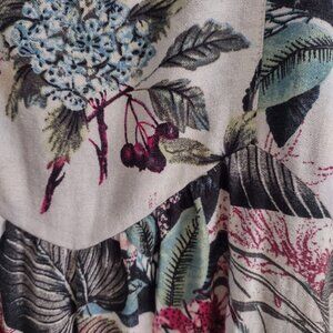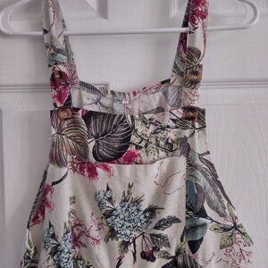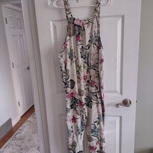 Comfortable loose fitting, linen like fabric in polyester blend. Adjustable button straps, two side pockets and one front pocket in bib. Full length to ankles.
