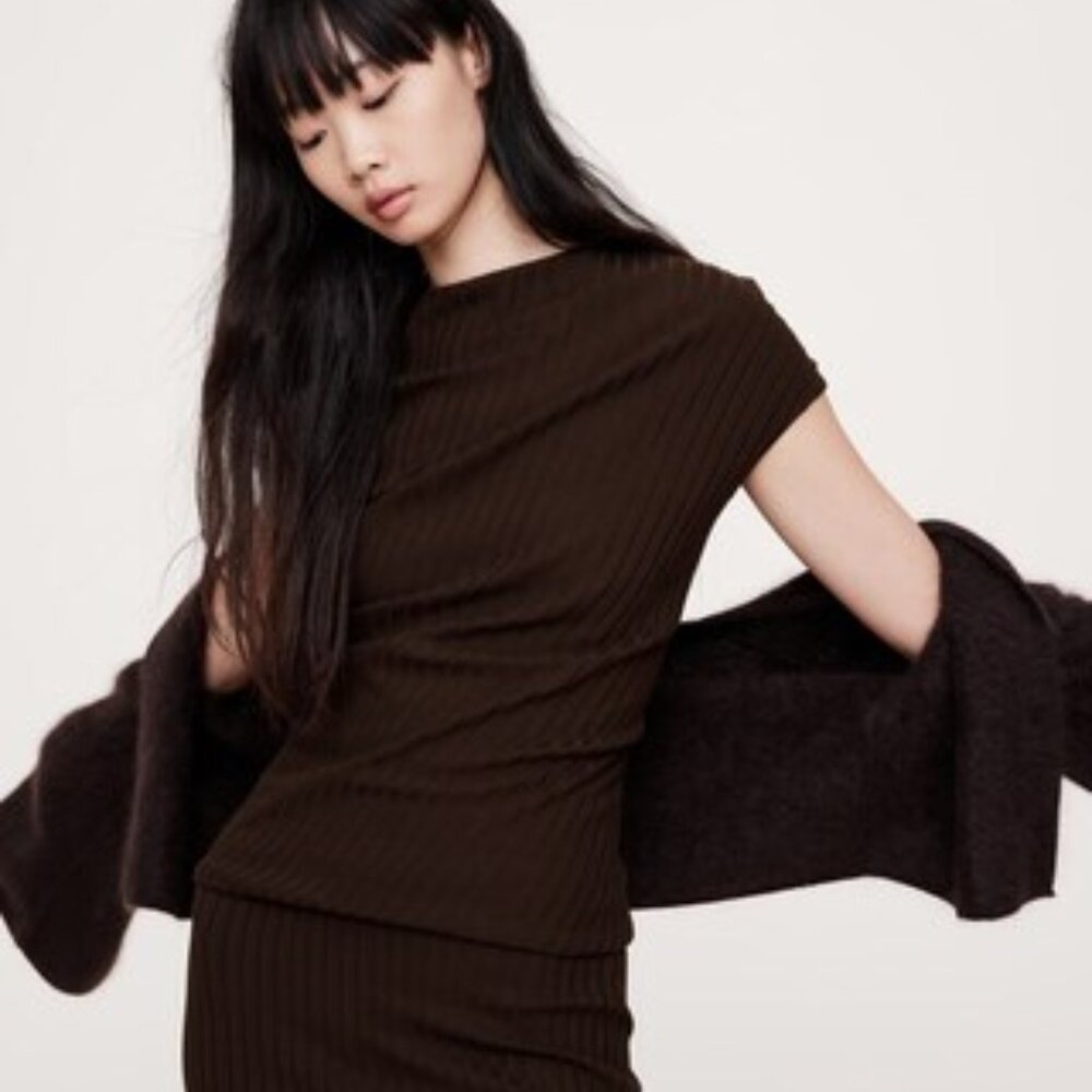 We cut this top from a soft and silky jersey fabric we love for its ribbed texture and fluid drape. Here, we added a draped detail at the side to create rich ripples and folds that accentuate the beautiful, subtle shimmer of this soft fabric. Color is Chocolate Ganache Brown. Size M.