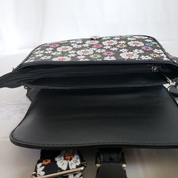 The strap is a matching flowers on black nylon type fabric with silver color hardware in clean and excellent condition. The strap is 1.5" wide and adjust in length from 14" to 23" drop from shoulder so it can easily convert from a shoulder bag to a crossbody bag.