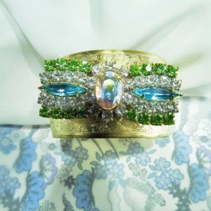 Wide cuff bracelet green, for women, with a nice bow buttons cabochon