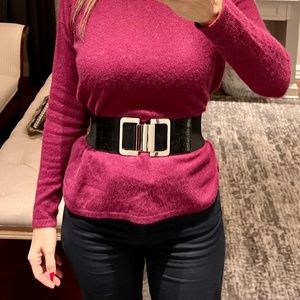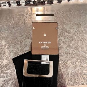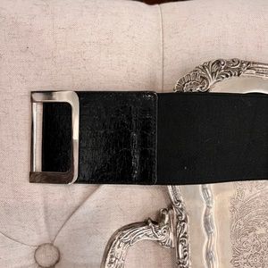 Wide elastic belt with silver clip from Express. Part adjacent to clip is shiny embossed patent leather look. Shown on waist of 28” measured over sweater. Very comfy due to the give of the elastic. Size XS/S.