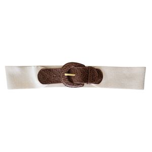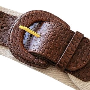Wide woven brown leather belt stretchy cream strap classic boho summer S/M