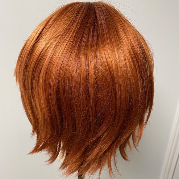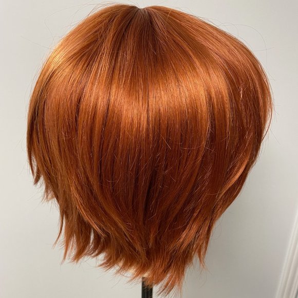 Up for sale is a wig from Arda in the style "Magnum". It's in the colour "Dark Copper Red". I've never actually worn the wig to an event. It was trimmed to suit my face for a Ron costume as part of a Harry Potter Cosplay group, but my friend group never got around to wearing our costumes. The wig was worn just to be trimmed and has been in storage for about a decade. It was trimmed by someone who isn't a professional, so the hair might need a bit of cleanup, but as you can see from photos, it's a cute style and the wig is a rich dark red colour. There may be some flyaways due to the hairs being trimmed and the general nature of synthetic wigs, but the condition is great. As it's a short wig, it can be brushed out pretty easily and shouldn't be too prone to tangling.