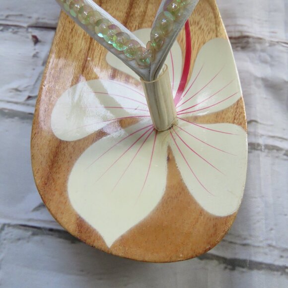 Check out these super cool Wild Honey Japanese Holibana style wooden flip flop sandals. These sandals have a beautiful white hibiscus design with sparkly sequins. They have only been worn once for an event. Thus in great condition. These sandals are a woman’s size 11. I have included some further measurements to ensure it’s a good fit for the right person.