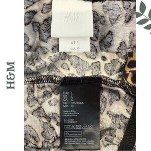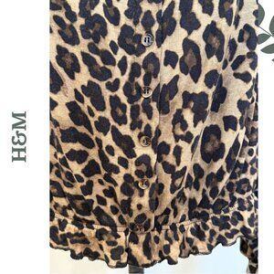 Bold and effortlessly chic, this H&M knit top features a classic leopard print in neutral tones, perfect for amping up any outfit. The elastic neckline allows for on- or off-the-shoulder styling, while the button front and subtle hem ruffle add just the right amount of detail. A versatile piece for dressing up denim or pairing with leather for a fierce night-out look.