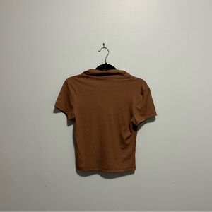 Wild Skye brown cropped tee with collar and embroidered flower. Size M. 95% polyester, 5% spandex. Tight fit. Pink and brown embroidered flower on left side! NWOT. All clothing items are washed prior, even if never worn.