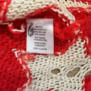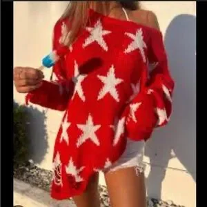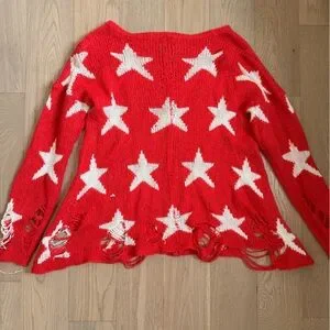 Soft knit sweater in bold red with white star pattern. Lightweight, relaxed fit with intentional distressed hem for an edgy look. Easy to layer and pairs well with jeans or skirts. Features long sleeves and an open neckline for a casual silhouette.