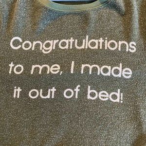 Dark Green Wildfox jumper that says "Congratulations to me, I made it out of bed!". Pre-owned, good condition. 47% polyester, 47% rayon, 6% spandex. White graphic print. Ribbed cuffs and hem scoop neckline. It is a lightweight jumper that is extremely comfortable, soft and stylish. Fits larger. It is in perfect condition.