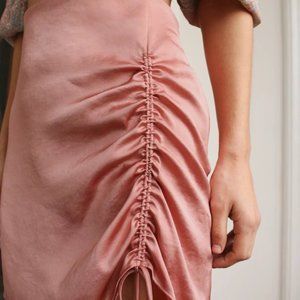 This is a high-rise, ruched mini skirt with a cinchable side tie. It’s made with lightweight, fluid satin fabric from Japan.