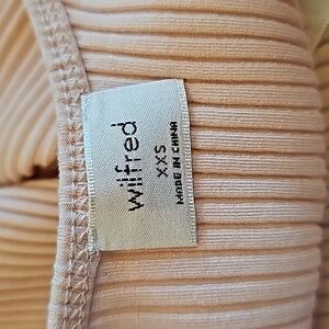 Aritzia's Wilfred Annecy Bodysuit. ribbed material. 'spaghetti straps' with a high neckline in the front and a big scooped neckline in the back. light baby pink in color. size 2XS